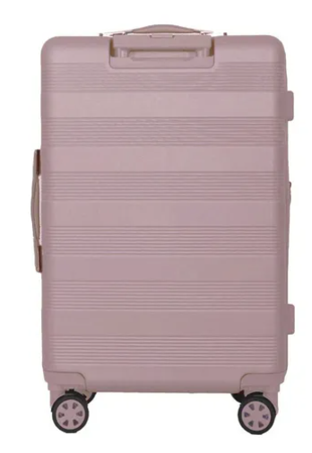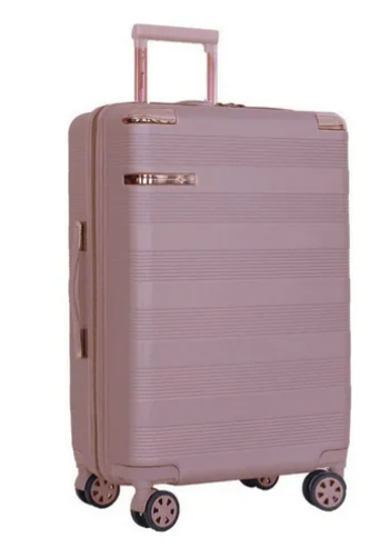O design combina elegância e praticidade, com a cor rosa claro conferindo um toque feminino e sofisticado. Os detalhes em rosé gold complementam harmoniosamente o conjunto, criando um visual contemporâneo ideal para viagens de negócios ou lazer.